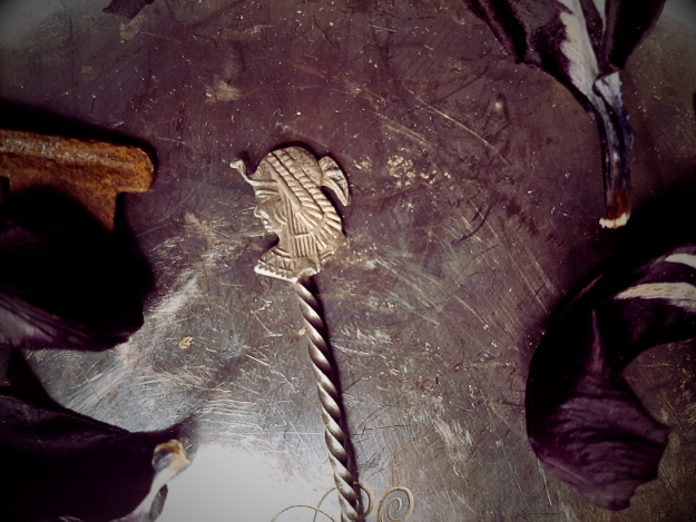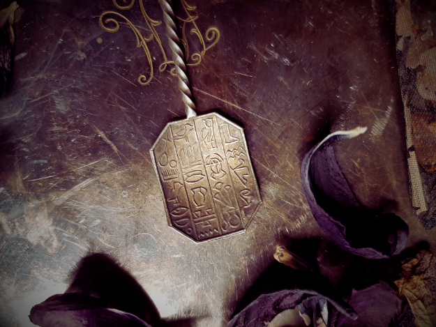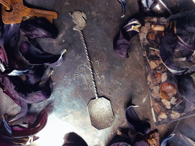 Vanha koristelusikka egyptiteemalla, todennäköisesti matkamuisto vuosien takaa.