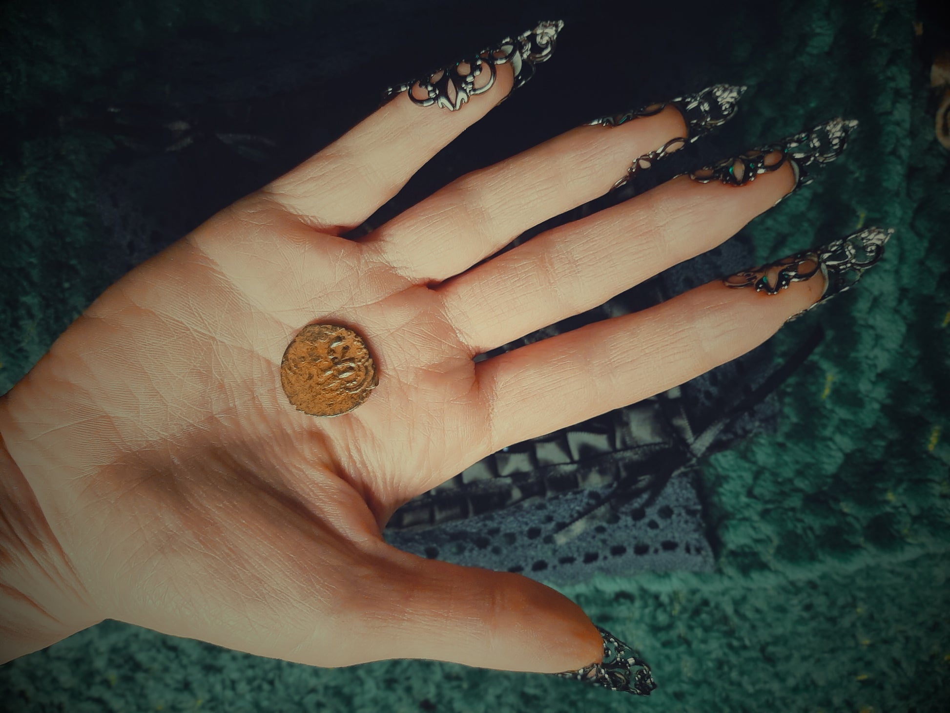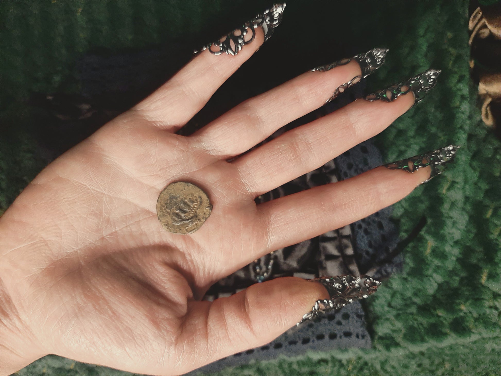 Tumman pronssin värinen metallikolikko, keskiajalta, Ayyubii-dynastian ajalta, vuosien 1171-1260 väliltä. Selvää kulumaa, mutta kuviointi on silti selkeä. Selvityksemme mukaan tämä on aikoinaan ollut puolikkaan "dirhamin" arvoinen. Nykyisin tämän kolikon arvo määräytyykin lähinnä sen iän ja historian takia --se on käynyt läpi monet kädet ja taskut, sekä lymyillyt kauan jossain päätyäkseen tänne. Mitä sillä on mahdollisesti aikoinaan ostettu, sitä emme osaa kertoa --mutta se tekeekin tästä entistä kiinnostavamman esineen! Oiva lisä lähi-idän historiasta kiinnostuneelle, tai historiallisempaan kummallisuuksien kabinettiin. Sopii myös alttarille koristeeksi tai meditoinnin avuksi.