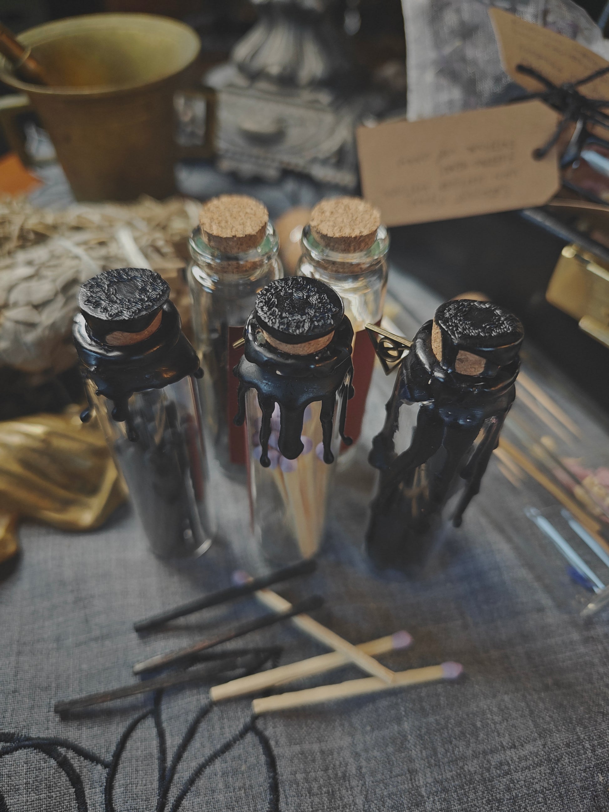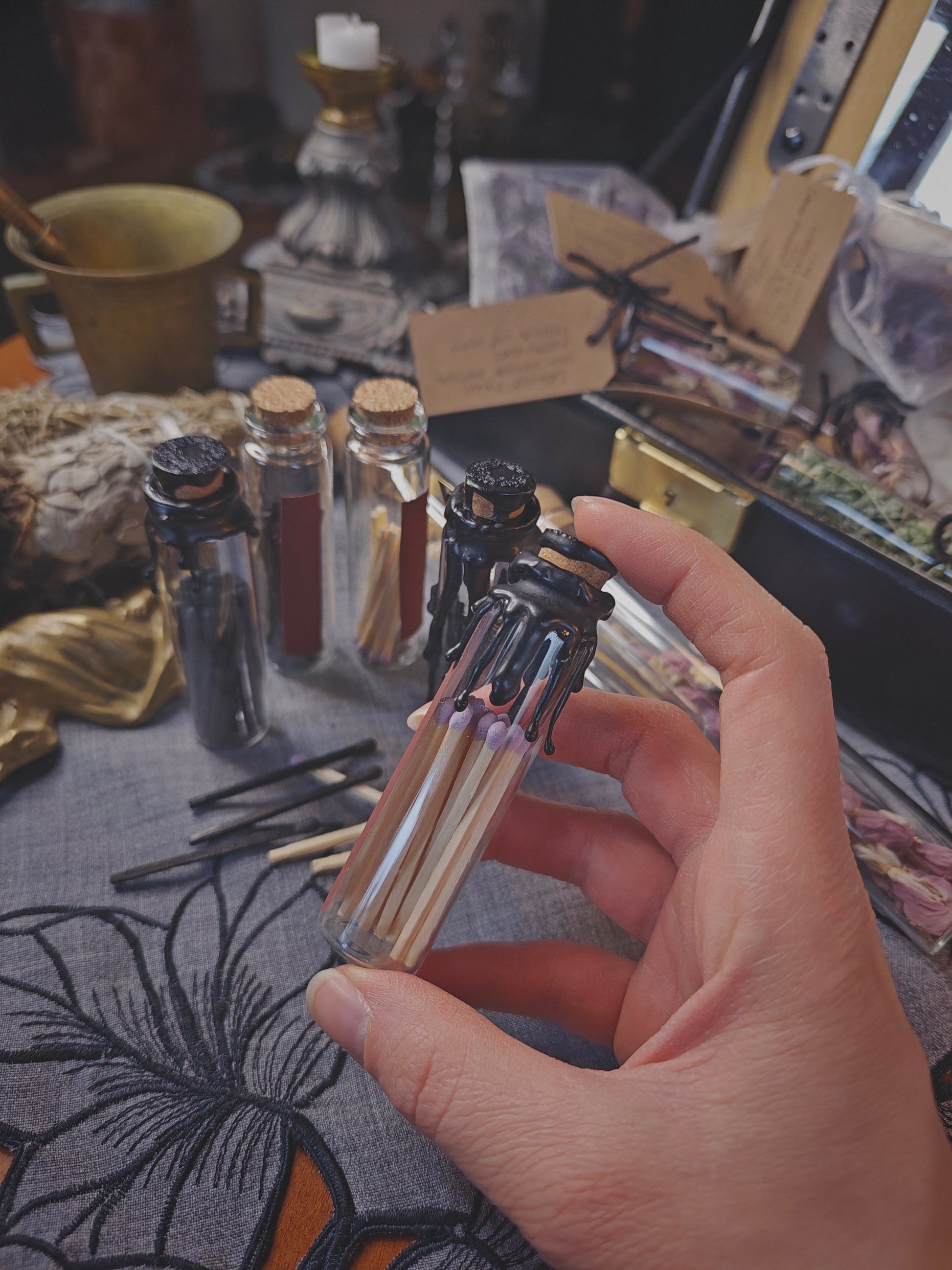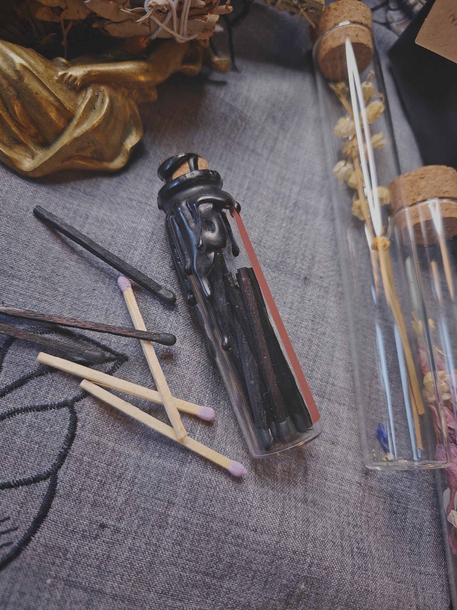 Mustia tai liloja tulitikkuja lasipurkissa, mustalla koristeellisella vahasinetillä. Purkin kyljessä on raapaisupinta. Purkki on aukaistavissa ja suljettavissa uudestaan vahasinetistä huolimatta. Hieno ja tunnelmallinen lisä esim. kotialttarille tai muuten vain tunnelmaa luomaan! Yhdessä purkissa on n.15 kpl:tta tulitikkuja, ja se on uudelleen käytettävissä.