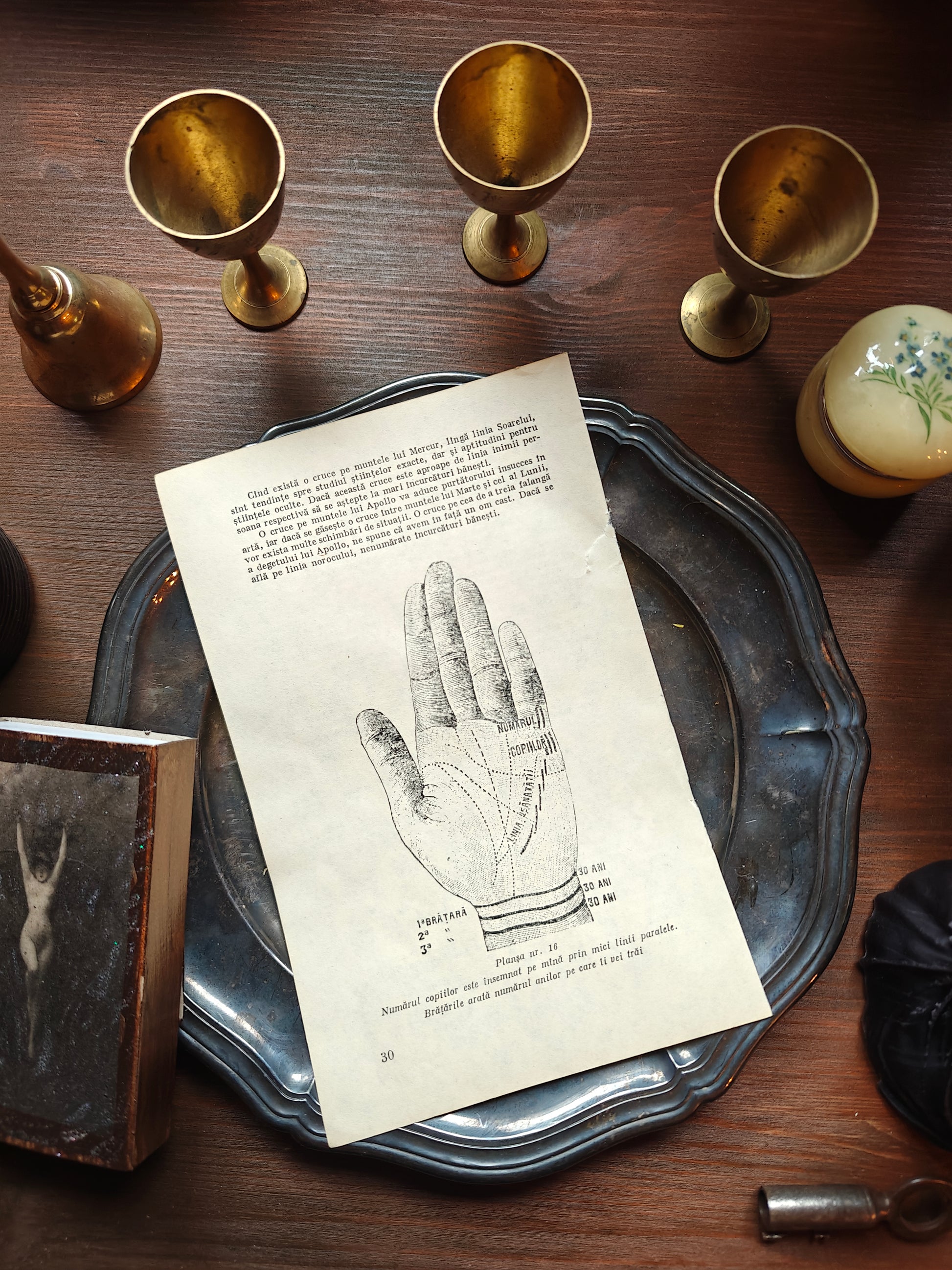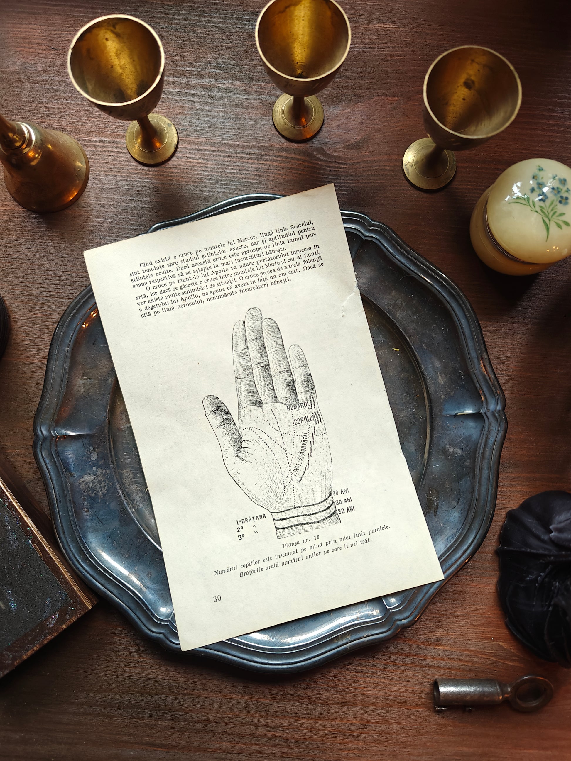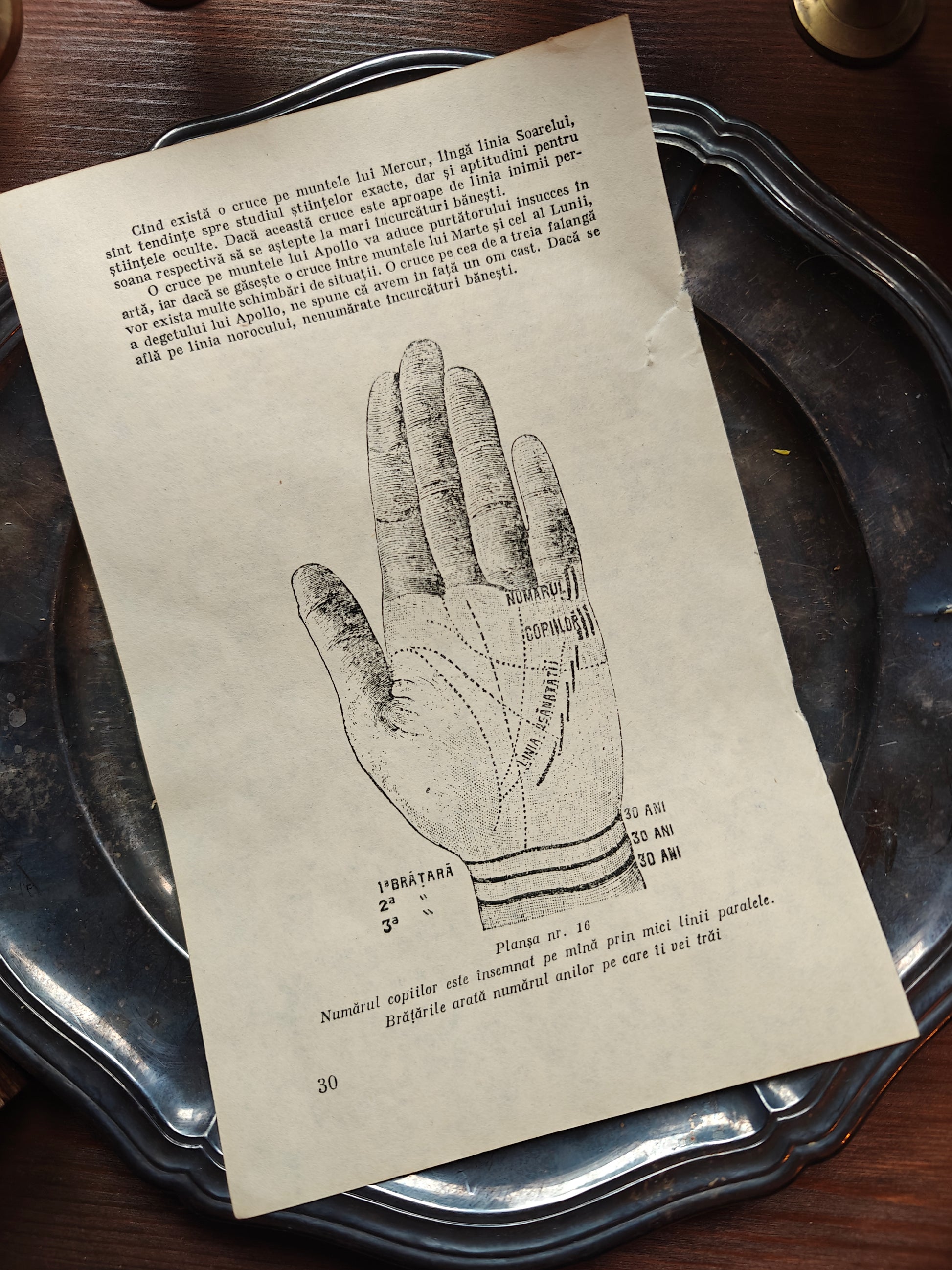 Sivu vanhasta romanialaisesta kädestälukemisen ohjeesta. Hieno esim. kehystettäväksi tai käytettäväksi vaikka kollaasitaiteessa!