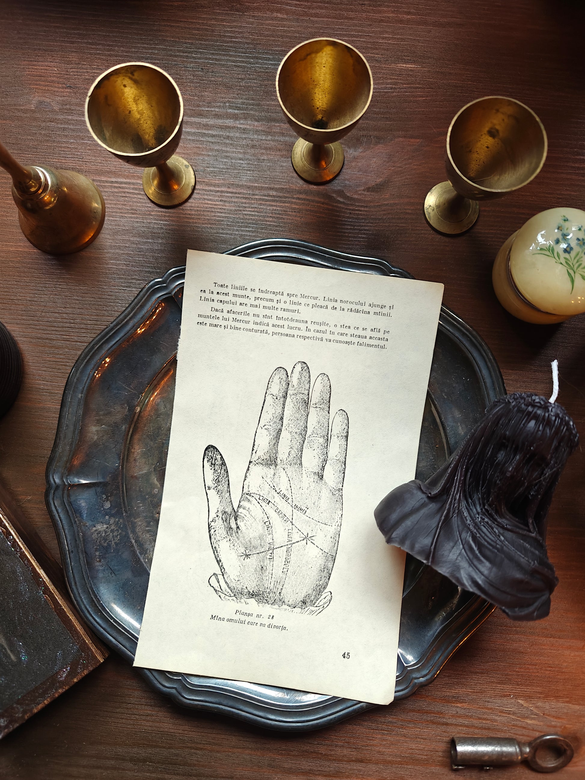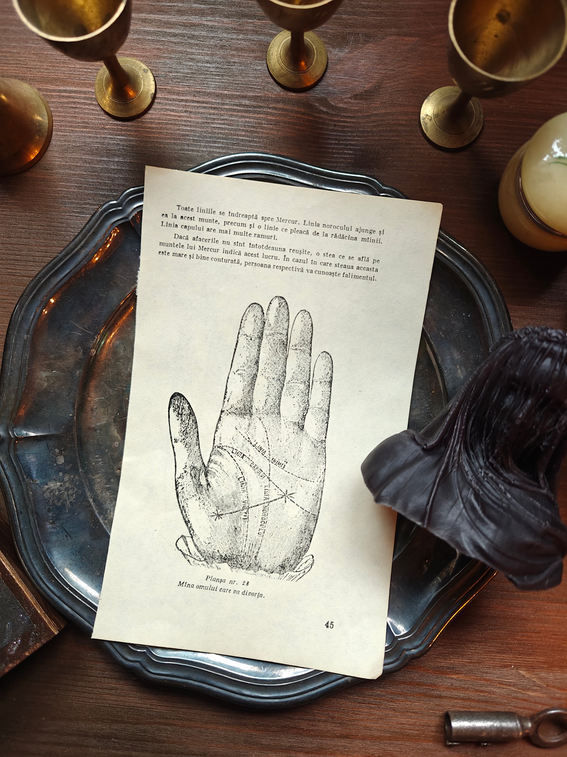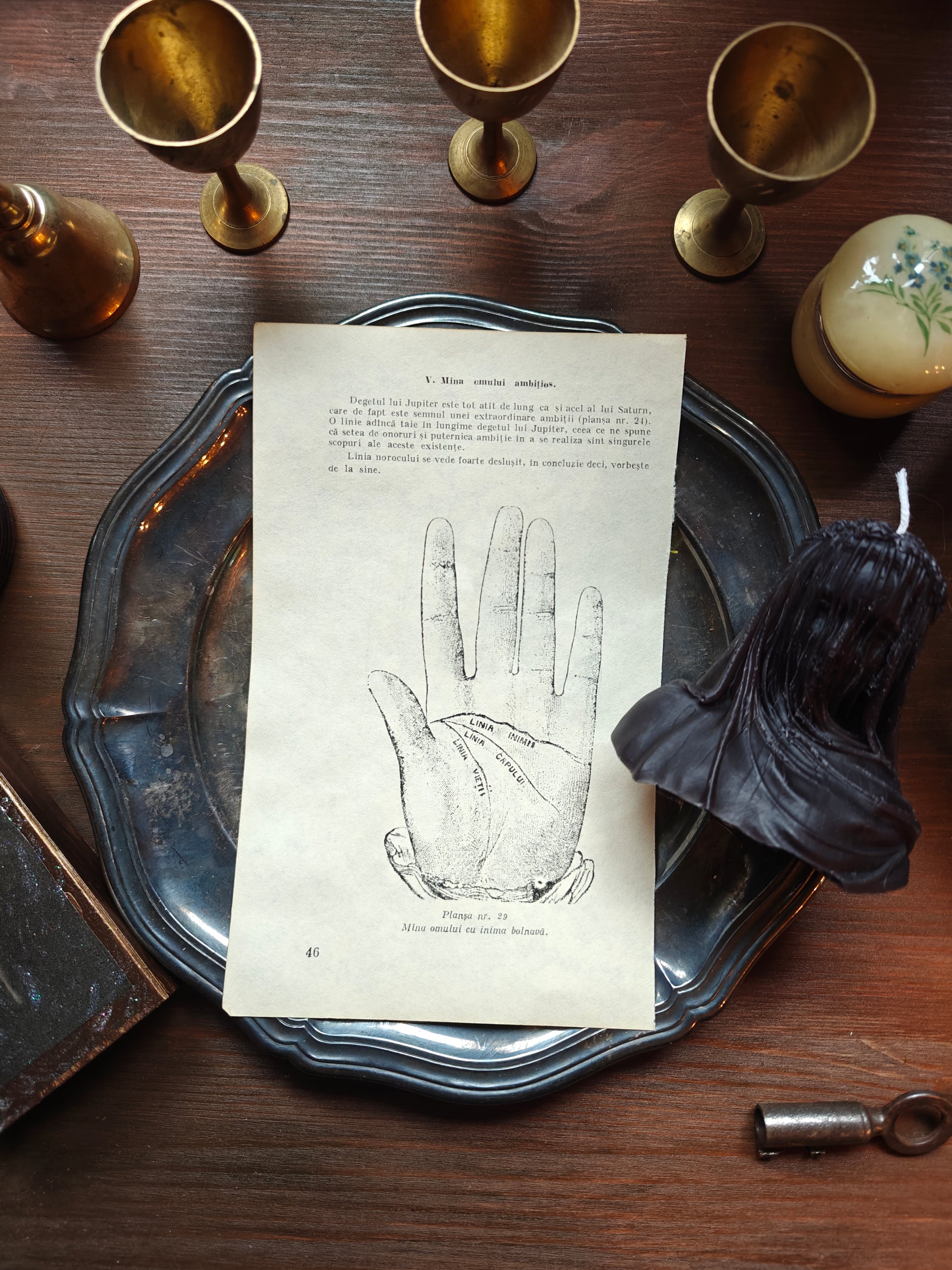 Sivu romanialaisesta kädestälukemisen ohjeesta. Tämä on kaksipuolinen, joten kaksi kuvaa yhden hinnalla! Sopii esim. kehystettäväksi tai kollaasitaiteen tekemiseen. Sisältää yhden, kuvan mukaisen sivun.
