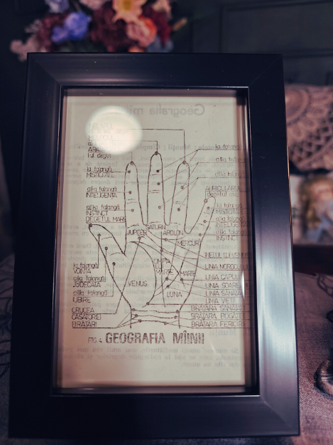 Vanha romanialainen kädestälukemisen ohje mustissa kehyksissä. Kehykset ovat uudet, mutta sisällä oleva paperi vanhaa, joten siitä kuultaa läpi myös toisen sivun teksti. Tämä kuva on siitä erikoisempi että se näyttää myös planeettoja vastaavat osat kämmenessä. Hieno lisä monenlaiseen tummaan salonkiin tai hippimäiseen vankkuriin, tai mikseipä ihan kotimaiseen rintamamiestaloonkin.
