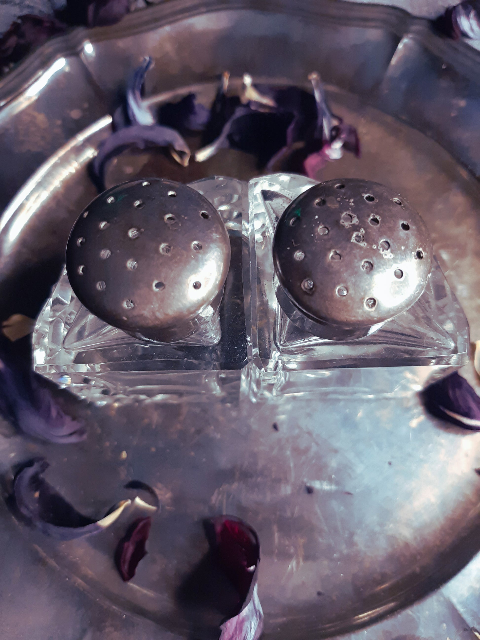 Vanhanajan kristallisirottimet esim. mustalle suolalle, tai jollekkin muulle --miksei vaikkapa kuuveden pirskottamiseen. Vanhanajan kristallituotteet ovat usein lyijypitoisia, joten emme suosittele näitä varsinaiseen ruokailukäyttöön.