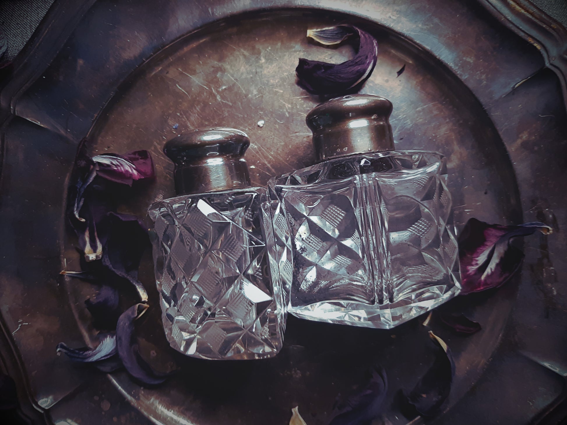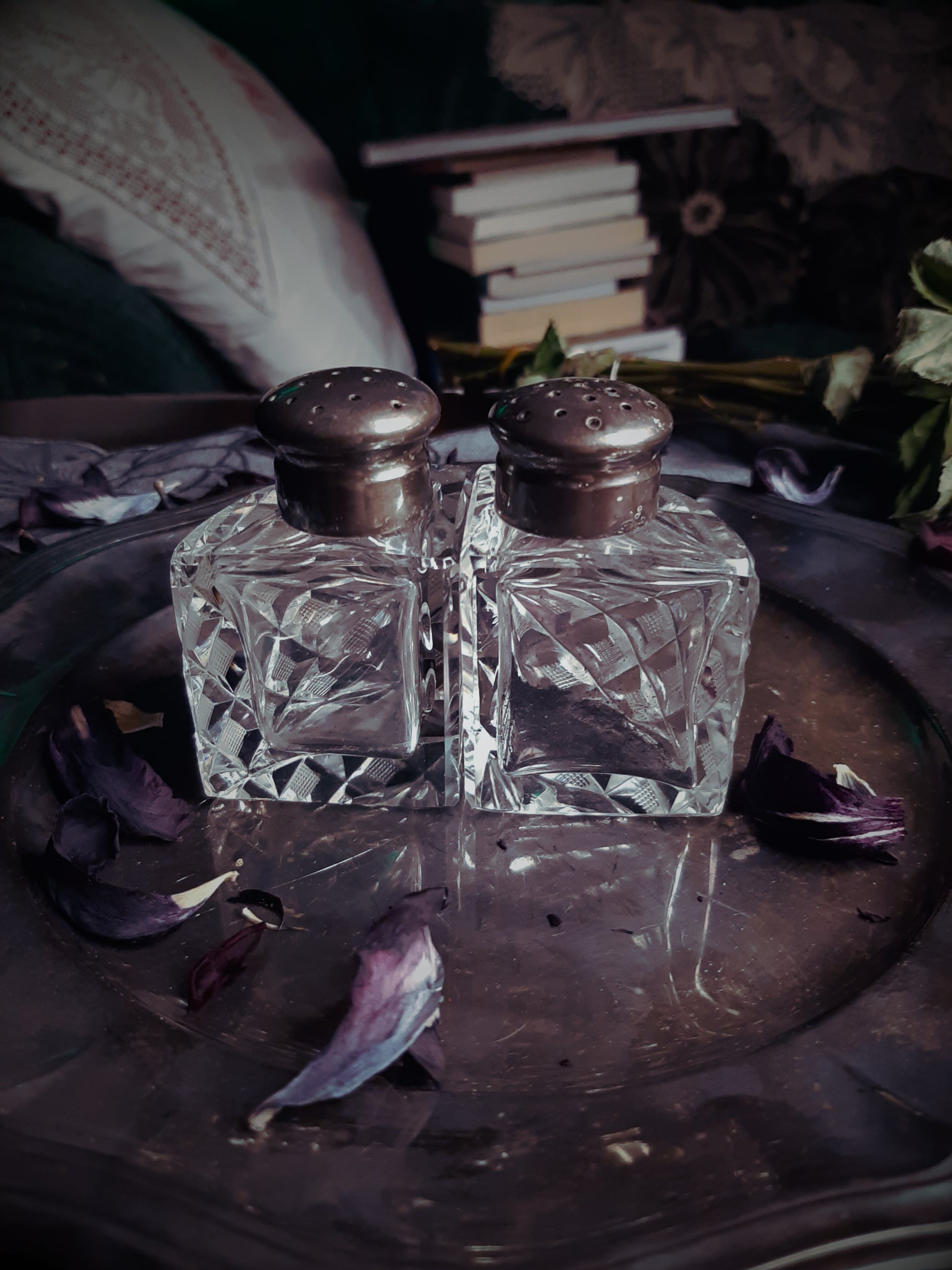 Painavat, mutta kauniit ja koristeelliset lisät alttarille. Myydään parina, ja sisältä tyhjinä. Sirotin-osat toimivat parhaiten mikäli suola on hienojakoista --paksumpaa suolaa tms. kannattaa ripotella suoraan purkin suuaukosta, kiertämällä sirotinkorkki irti.