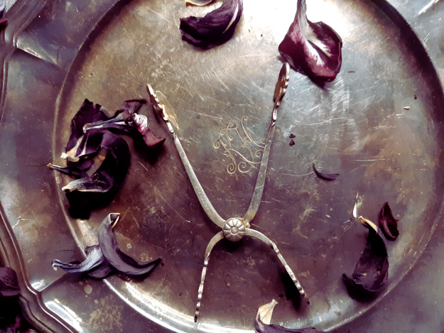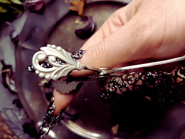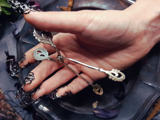 Koristeellliset, mahdollisesti alpakkaa olevat sokeripihdit, jotka sopivat esimerkiksi suitsukehiilen tai paperin polttamiseen. Toki myös sokeripalakahvin unohdettuun taiteenlajiin nämä menevät vielä mainiosti. Näissä on hieno, kasvillisuutta jäljittelevä kuviointi, ja yleisilme on siisti, ei pahempia naarmuja. Tätä mallia ei ole tullut niin paljoa vastaan kuin esimerkiksi "kotkankynsiä".