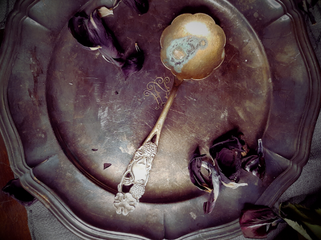 Kahvaosa hopeanvärinen, ja lusikkaosa kultainen. Materiaaliltaan tämä on ns."uushopeaa".