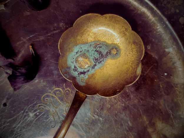 Vanha ja koristeellinen, hyvin patinoitunut lusikka. Keittiökelpoista tästä tuskin enää saa, mutta mitä ikinä möyhitkään alttarillasi, tee se tällä! Tämä oman aikansa hieno tuote on noin ruokalusikan kokoinen, ja omaa takapuolella kaiverruksen "RaU 2". Mahdollisesti siis palkinto esim. hiihtokisoista.